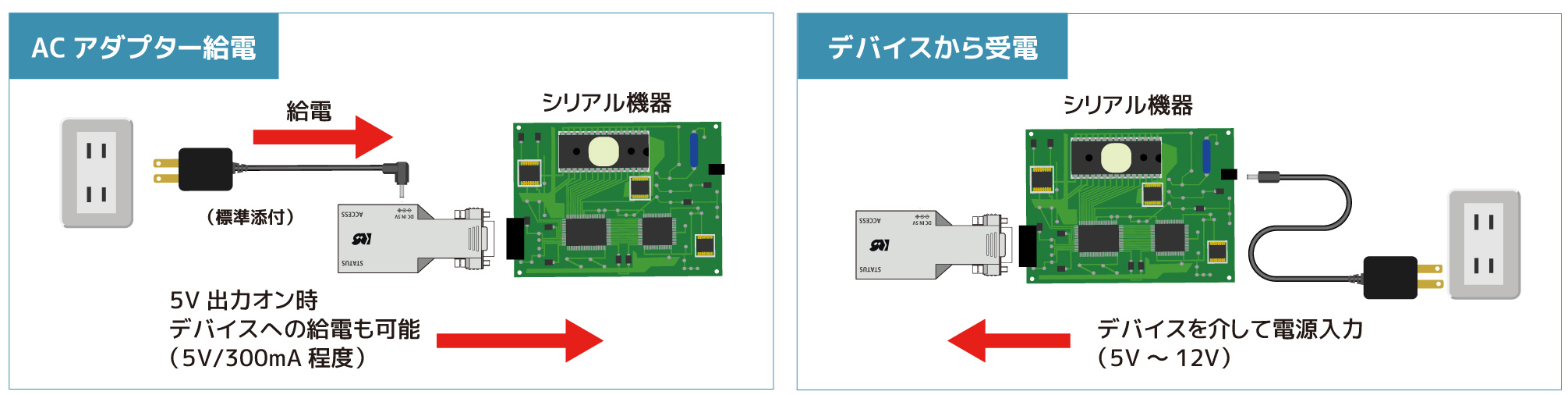 また、本製品のDIPスイッチの5V出力をオンにしてACアダプターを接続すると、D-Sub 9番ピンから外部の機器へ5V/300mA程度の電源を供給することもできます。