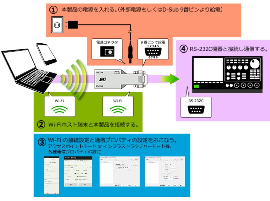 シリアルインターフェイスを持たないPCやiOS端末、Android端末なども接続することができ、対象の機器との距離が離れている場合など様々な用途に使用が可能です。